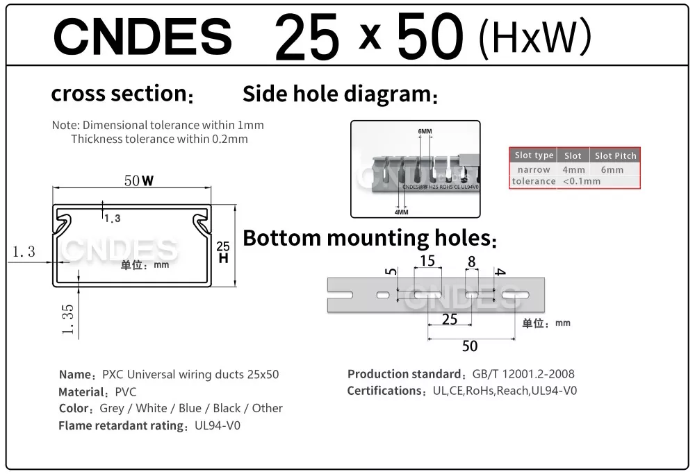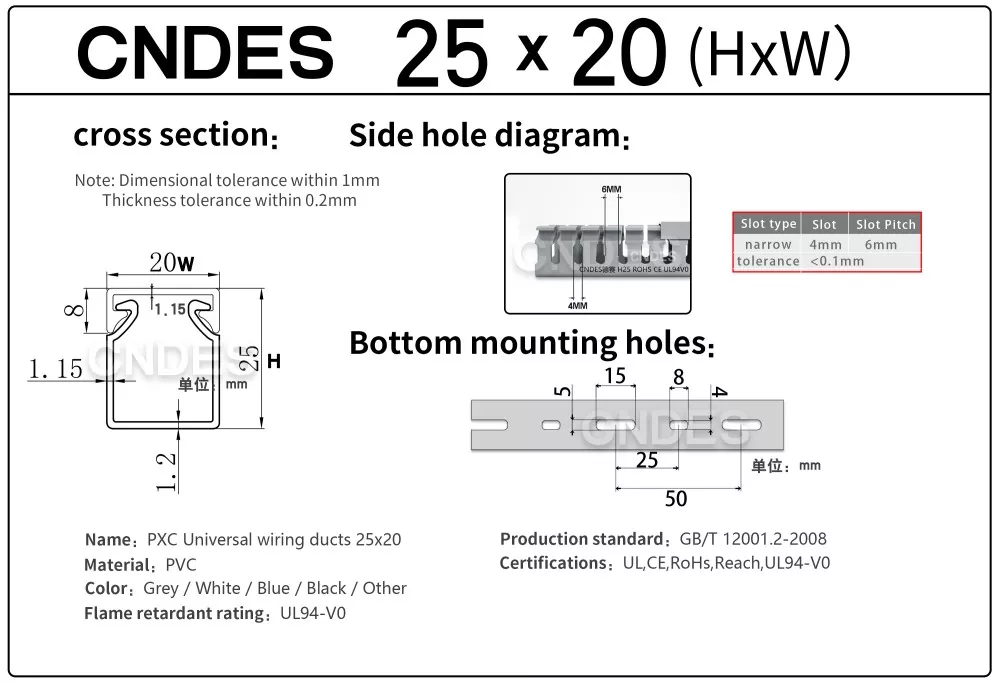 మా స్వతంత్రంగా అభివృద్ధి చేయబడిన హై-ప్రెసిషన్ స్టాంపింగ్ పరికరాల ద్వారా, ప్రత్యేకమైన సెగ్మెంటెడ్ ఆటోమేటిక్ కట్టింగ్ ప్రాసెస్తో కలిపి, CNDES అనేక స్పెసిఫికేషన్లలో ఉత్పత్తులను సరళంగా ఉత్పత్తి చేయగలదు, వీటిలో అధిక-పనితీరు గల 25mm ఎత్తు PVC స్లాట్డ్ కంట్రోల్ ప్యానెల్ డక్ట్లు, కంట్రోల్ క్యాబినెట్లు మరియు ఎలక్ట్రికల్ సిస్టమ్లలో కస్టమర్ల విభిన్న అవసరాలను తీర్చగలవు.