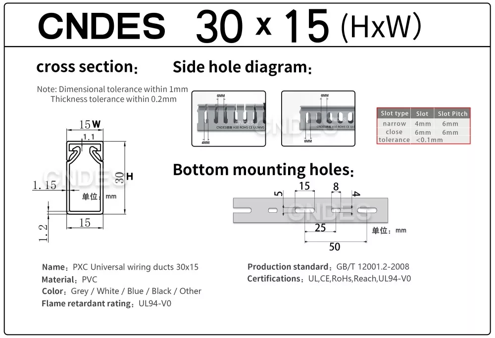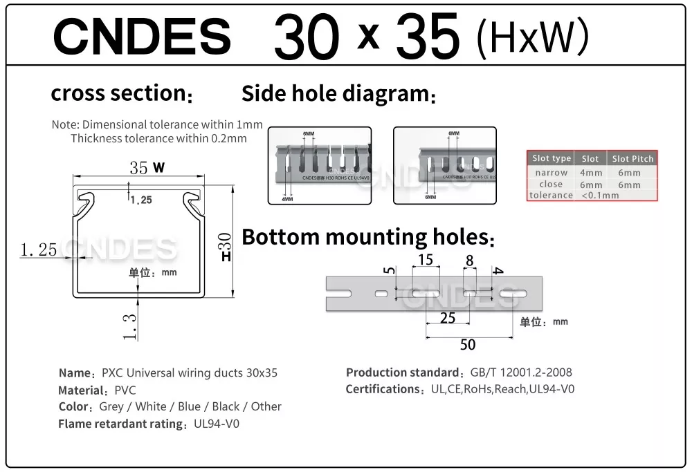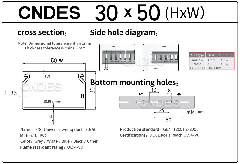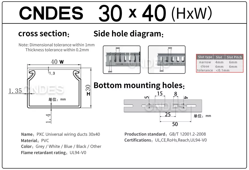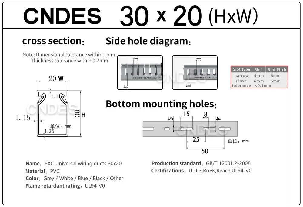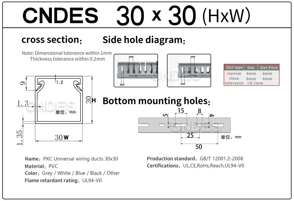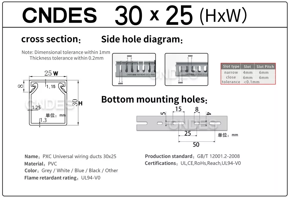 ఇది మా నాణ్యత 30mm ఎత్తు స్లాటెడ్ PVC కేబుల్ మేనేజ్మెంట్ డక్ట్ యొక్క మందం, కొలతలు మరియు డ్రిల్లింగ్ వంటి సమాచారాన్ని కలిగి ఉంటుంది.