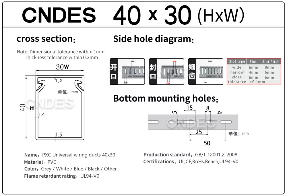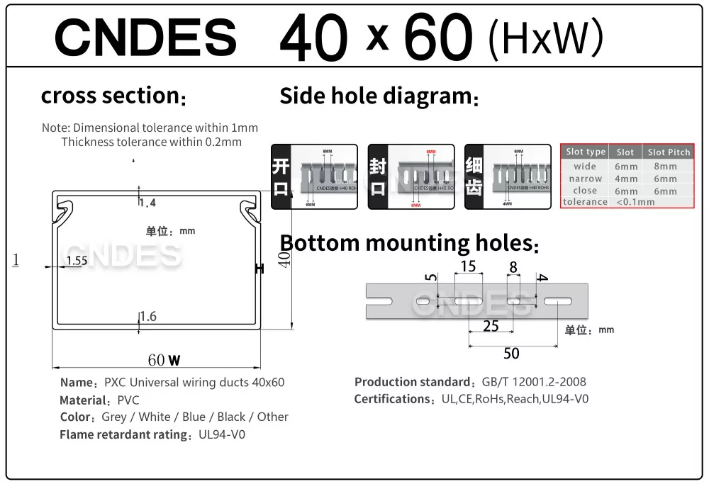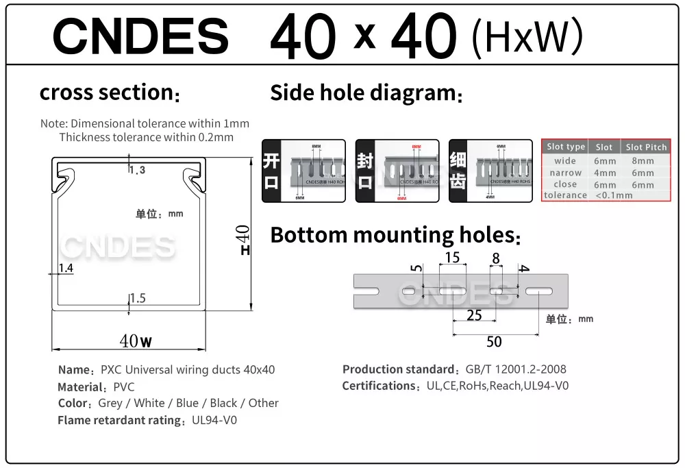 CNDES ప్రముఖ స్లాటెడ్ PVC వైరింగ్ రేస్వే డక్ట్ తయారీదారులు & సరఫరాదారులు. ఇక్కడ మేము 40*25, 40*30, 40*35, 40*40 మరియు 40*60తో సహా మా 40mm-ఎత్తు కేబుల్ ట్రేలను పరిచయం చేస్తాము.