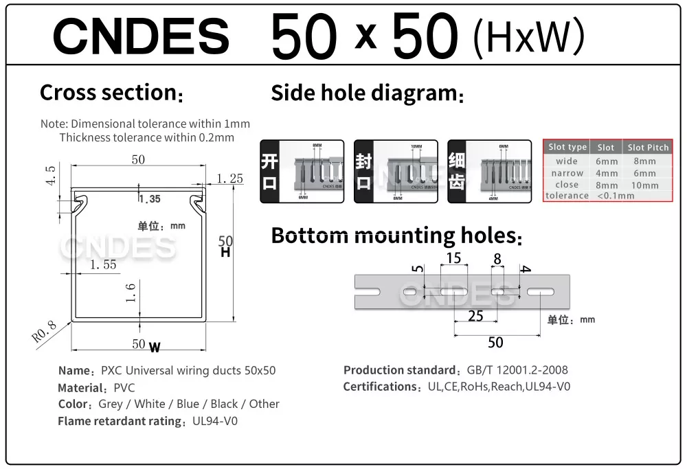 చైనాలో ప్రొఫెషనల్ PVC వైరింగ్ డక్ట్ తయారీదారు మరియు సరఫరాదారు అయిన CNDESచే తయారు చేయబడింది, ఈ మోడల్ వశ్యత, భద్రత మరియు దీర్ఘకాలిక మన్నిక అవసరమయ్యే అప్లికేషన్లలో విస్తృతంగా ఉపయోగించబడుతుంది.