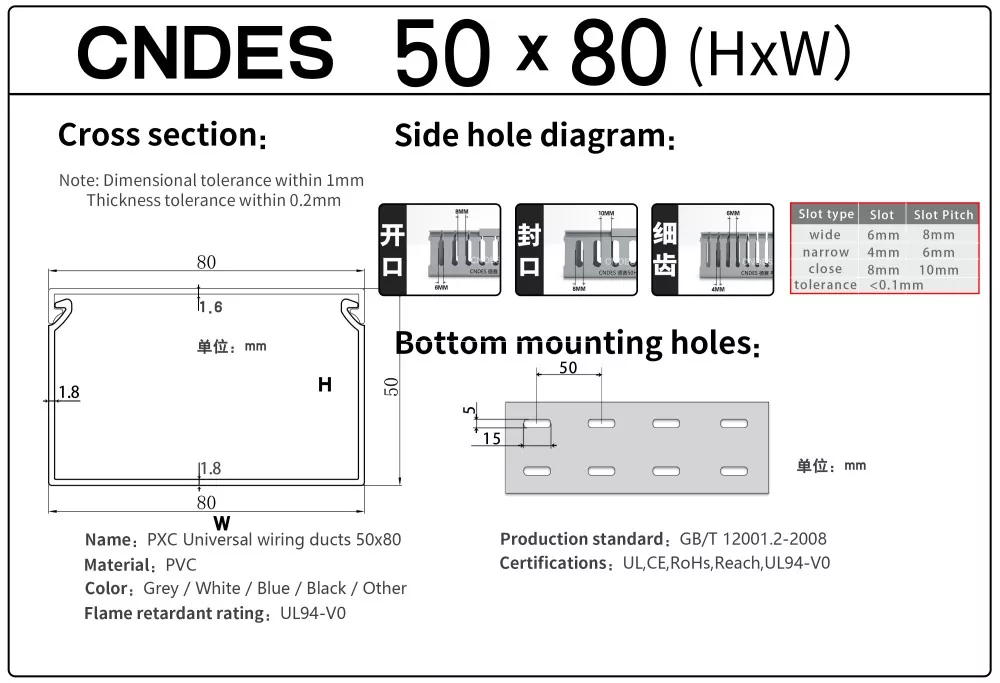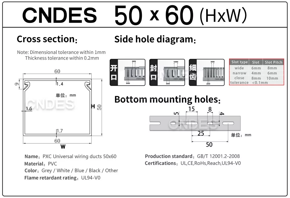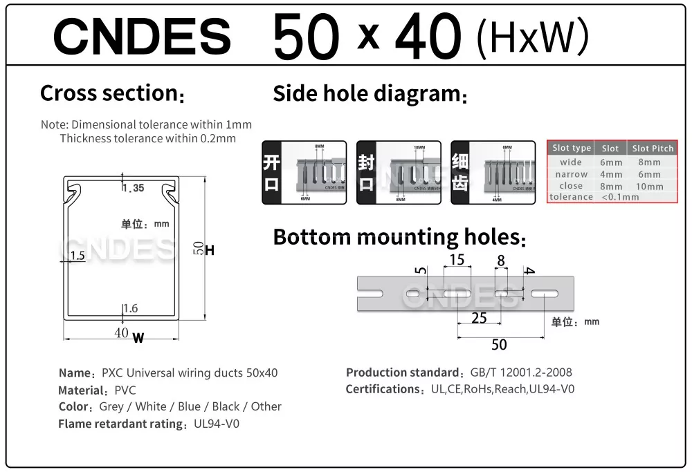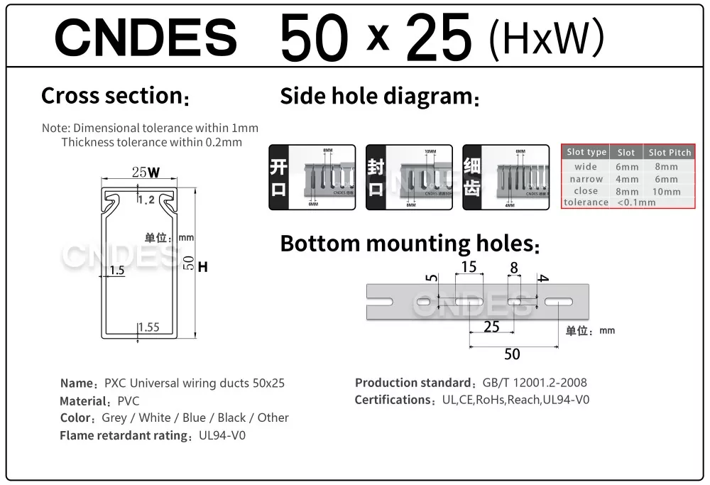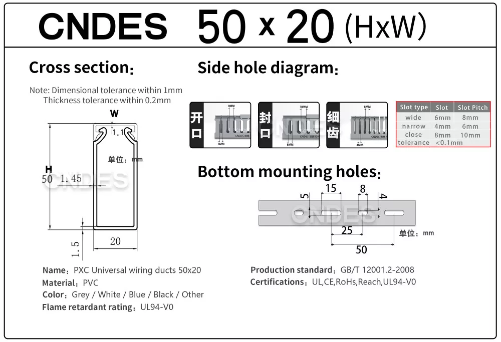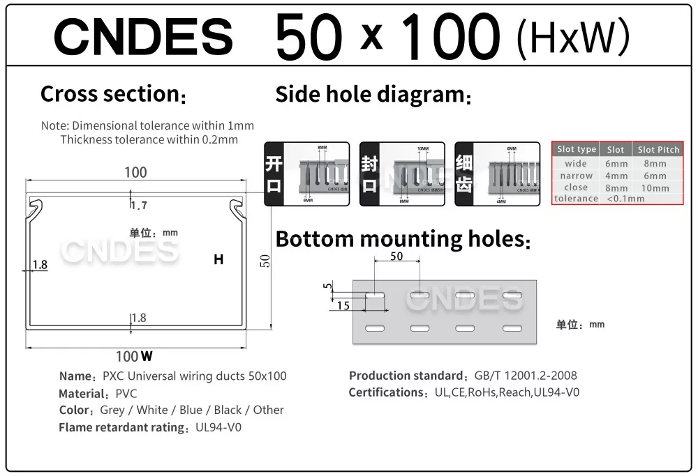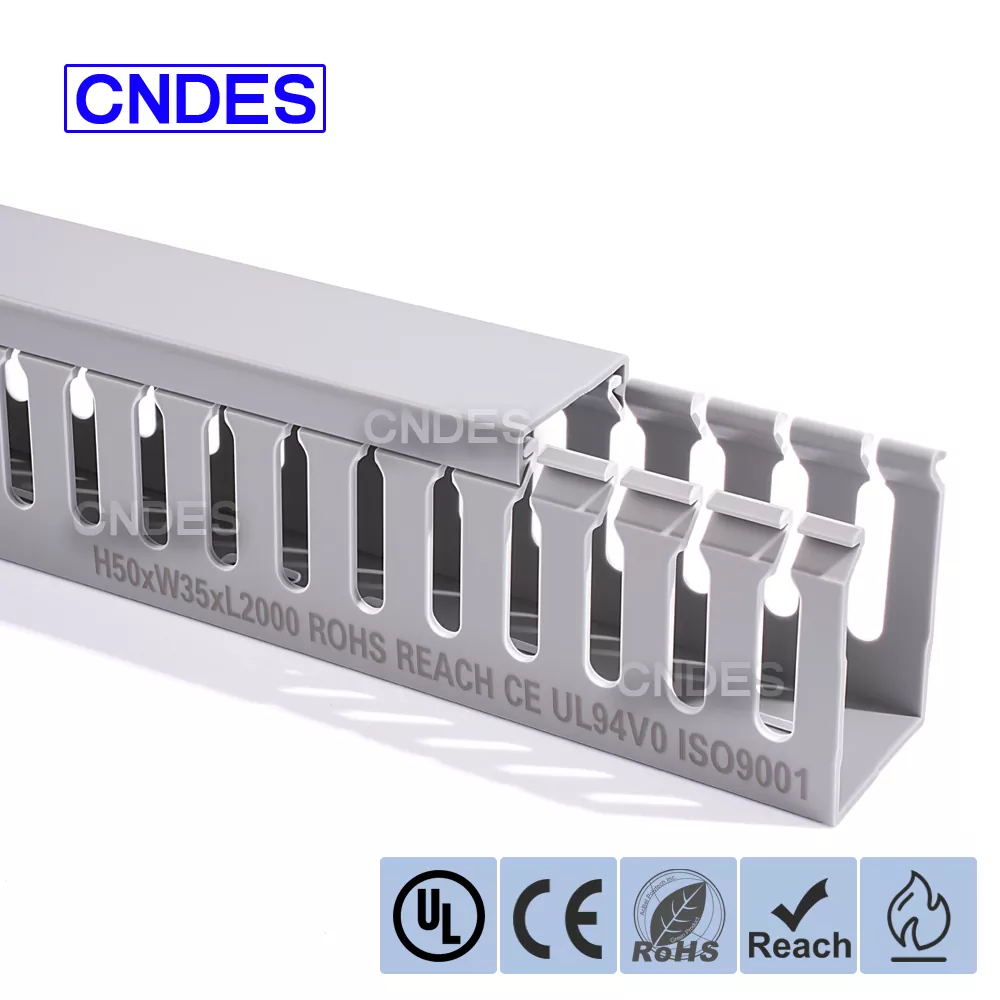 CNDES అనేది స్లాట్డ్ PVC ప్యానెల్ వైరింగ్ డక్ట్ను సరఫరా చేయడంలో ప్రత్యేకత కలిగిన తయారీదారు మరియు సరఫరాదారు. ఇక్కడ మేము మా 50mm హై వైరింగ్ ట్రంక్ను పరిచయం చేస్తాము, ఇందులో క్రింది స్పెసిఫికేషన్లు ఉన్నాయి:50*20,50*25,50*30,50*35,50*40,50*45,50*50,50*55,50*60,50*80,50*100.