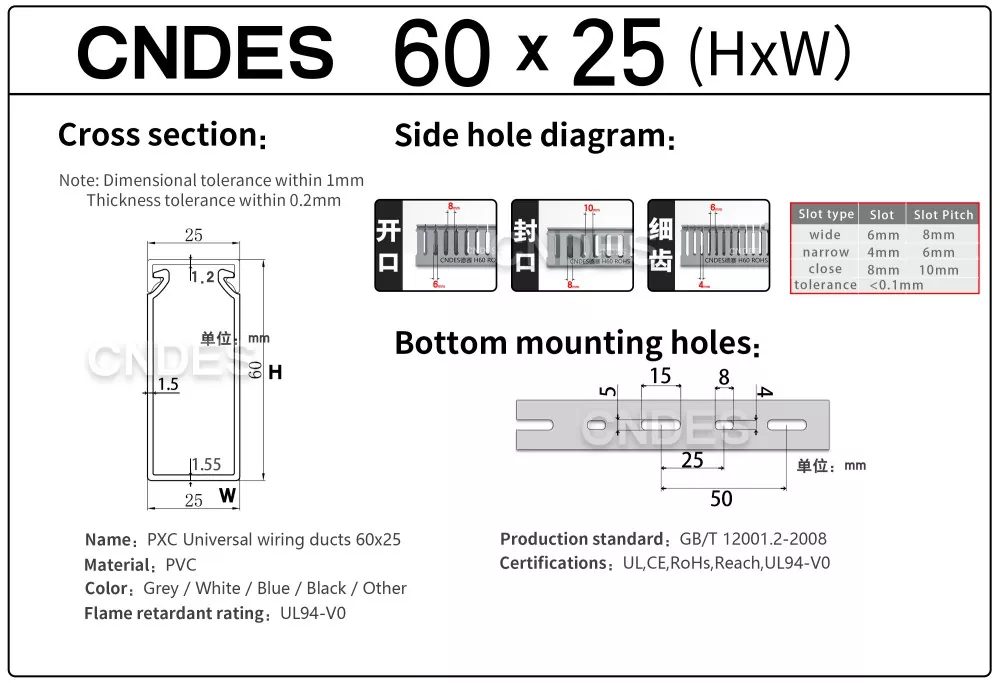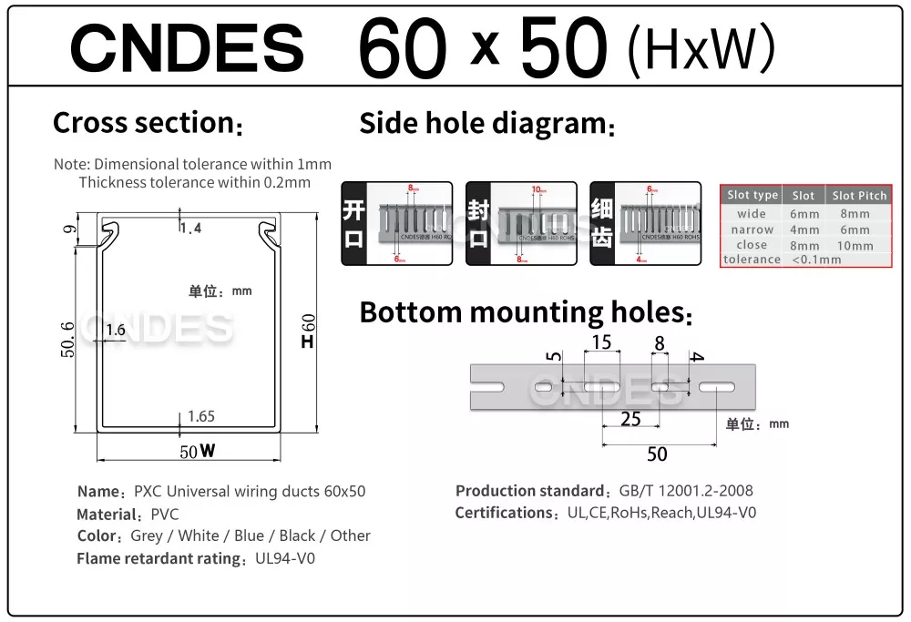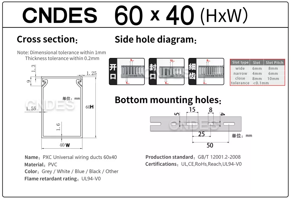 CNDES వద్ద, మేము వైరింగ్ నాళాల కోసం సమగ్ర అనుకూలీకరణను అందిస్తాము. మా సేవలు ప్రత్యేకమైన ఫంక్షనల్ ఫీచర్లు (యాంటీ-స్టాటిక్, UV-రెసిస్టెంట్, ఈజీ-బ్రేక్) మరియు పూర్తి డైమెన్షనల్ సర్దుబాట్లు (పొడవు, ఎత్తు, వెడల్పు, రంధ్రం స్థానం/ప్రొఫైల్/పిచ్) నుండి సౌందర్య బ్రాండింగ్ ఎంపికల వరకు (కస్టమ్ రంగులు, లోగో, టెక్స్ట్ ప్రింటింగ్) వరకు ఉంటాయి. మేము అంటుకునే మద్దతును కూడా అందిస్తాము.