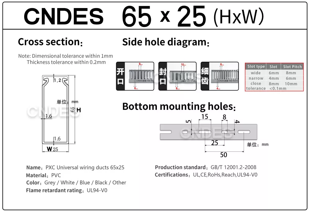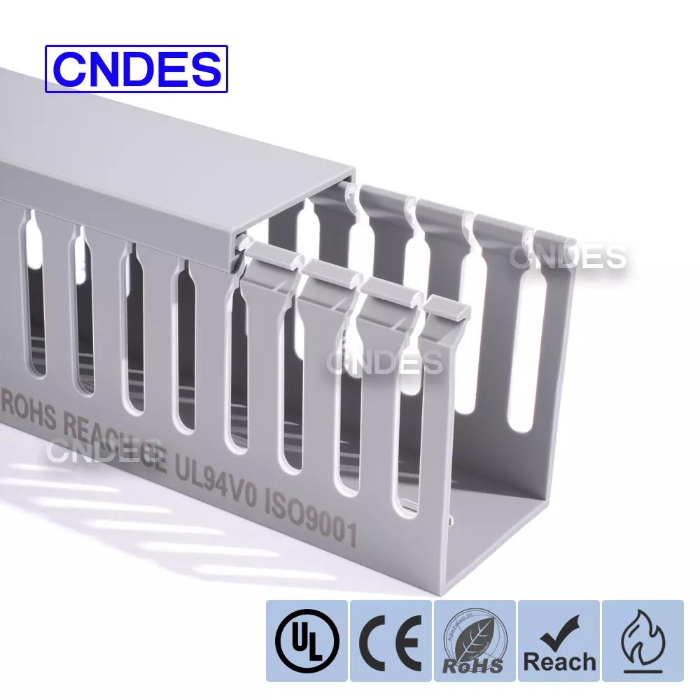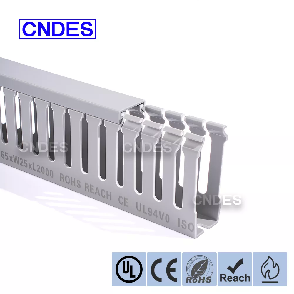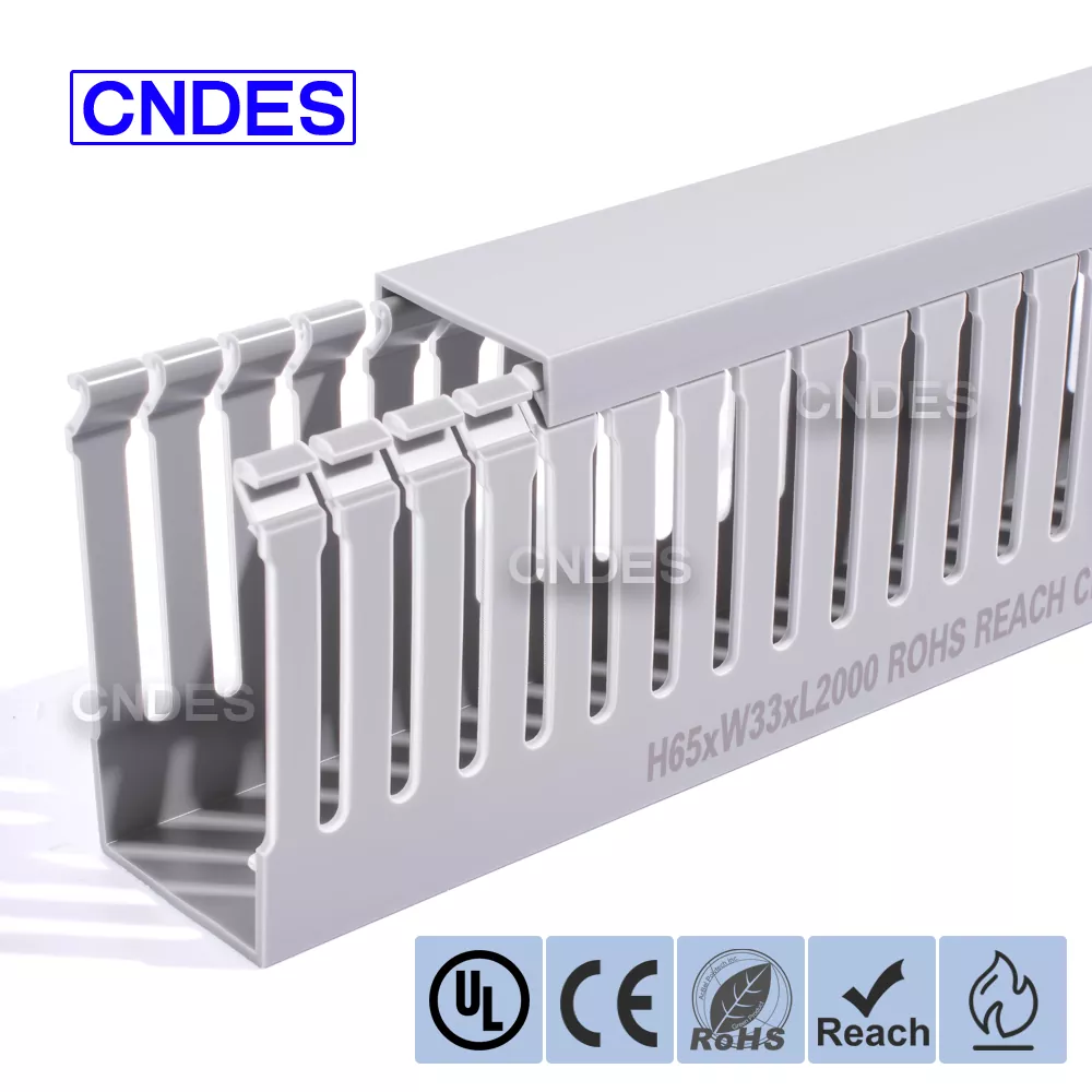 CNDES అనేది 24 సంవత్సరాల అనుభవం కలిగిన PVC కేబుల్ వైరింగ్ డక్ట్ సోర్స్ ఫ్యాక్టరీ. అనుకూలీకరించిన 65mm ఎత్తు స్లాట్డ్ PVC ఇండస్ట్రియల్ వైరింగ్ డక్ట్ అనేది పారిశ్రామిక నియంత్రణ ప్యానెల్లు, ఆటోమేషన్ పరికరాలు మరియు మెషినరీ ఇన్స్టాలేషన్ల వంటి అధిక-సాంద్రత వాతావరణంలో వైరింగ్ను నిర్వహించడానికి మరియు రక్షించడానికి ఒక ఆదర్శవంతమైన పరిష్కారం. 65 మిమీ ఎత్తుతో, ఇది పెద్ద కేబుల్ బండిల్లను ఉంచడానికి తగినంత స్థలాన్ని అందిస్తుంది, అదే సమయంలో దుమ్ము, తేమ మరియు యాంత్రిక నష్టం వంటి పర్యావరణ కారకాల నుండి సరైన రక్షణను అందిస్తుంది.